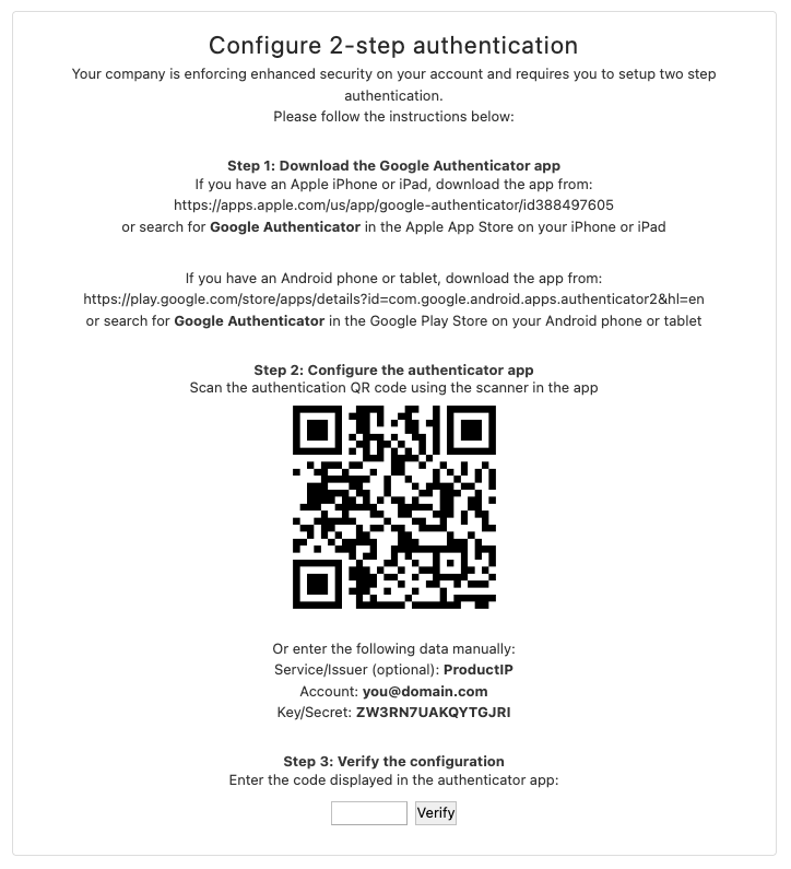 Two-factor authentication (2FA) adds an extra layer of security to your ProductIP account. Once enabled, users must verify their identity using a second step when logging in. This helps protect your company data from unauthorised access and reduces the risk of compromised accounts.