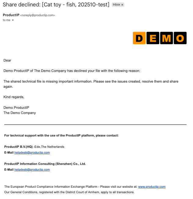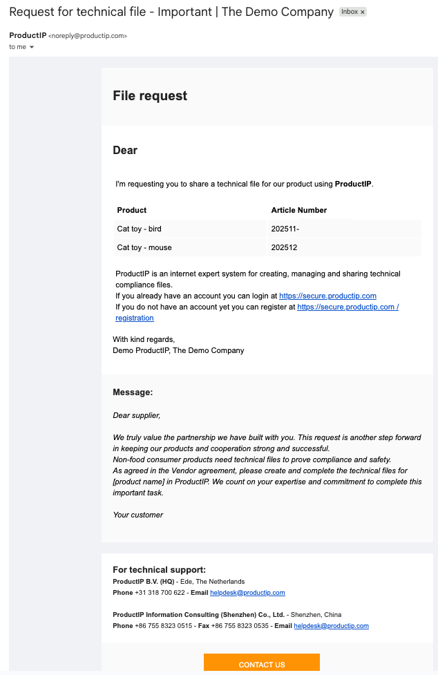 Through the ProductIP platform, your customer can request that you create and share a technical file for one or more products. This feature helps suppliers demonstrate product compliance efficiently and ensures all required documentation is shared securely.