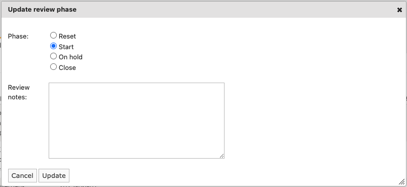 - Following window will open where you can chose different review phases. Review notes are only visible at this stage of the review. Once the technical file is declined or reviewed this information is no longer visible.